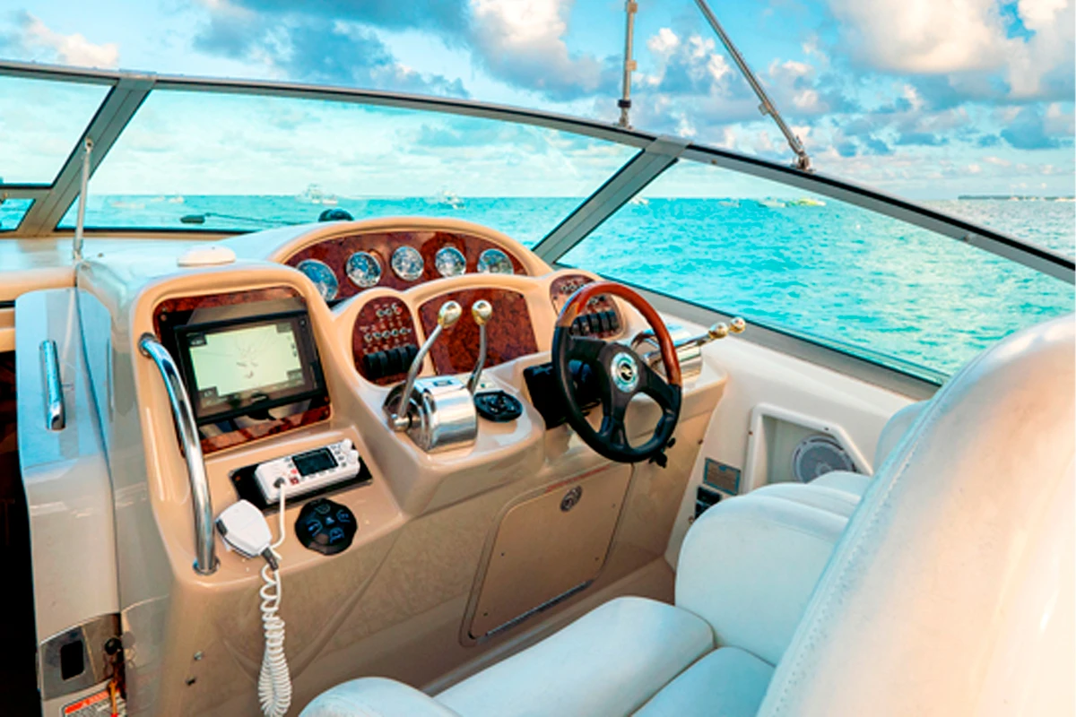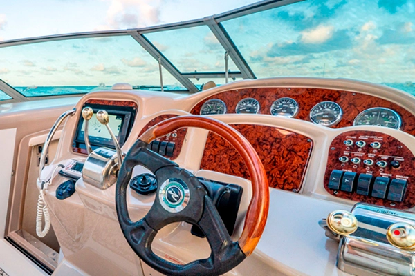 Close-up of a modern yacht cockpit with advanced navigation systems and steering wheel