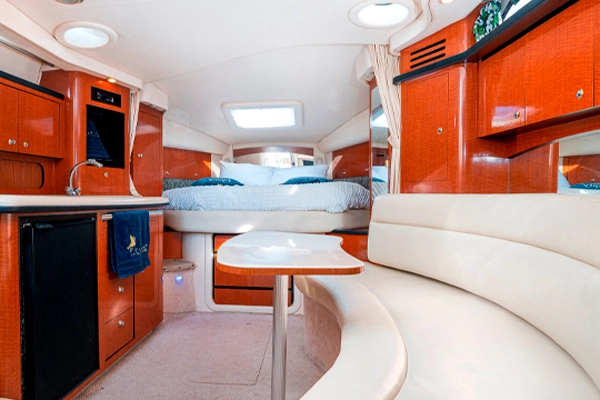 Luxury yacht interior cabin featuring a comfortable double bed, built-in wooden furniture, and a fully equipped kitchenette