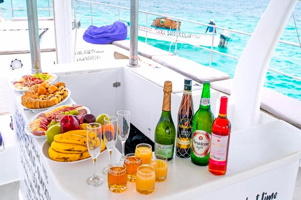 Indulge in a delightful brunch that defies the ordinary. In the heart of the sea, relish a sumptuous spread of fresh tropical fruits, a selection of fine cheeses and ham, freshly baked bread, and delightful cupcakes. Complement your meal with a choice of refreshing beverages, from revitalizing fruit juices and mimosas to the spirited flavors of Cuba Libre and Santo Libre, not forgetting the crisp Presidente beer.